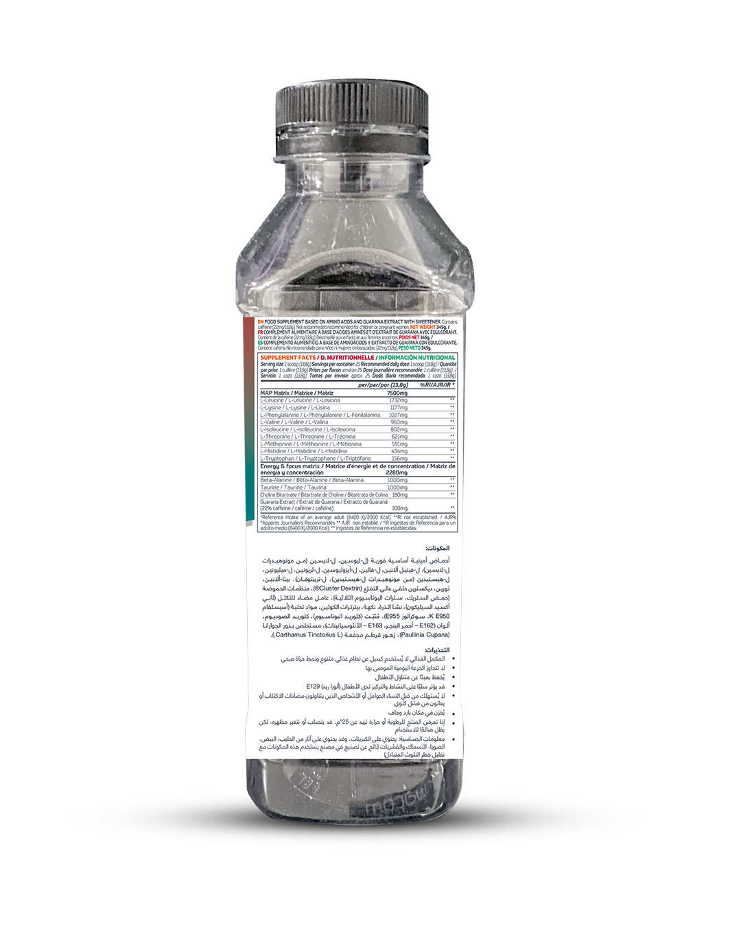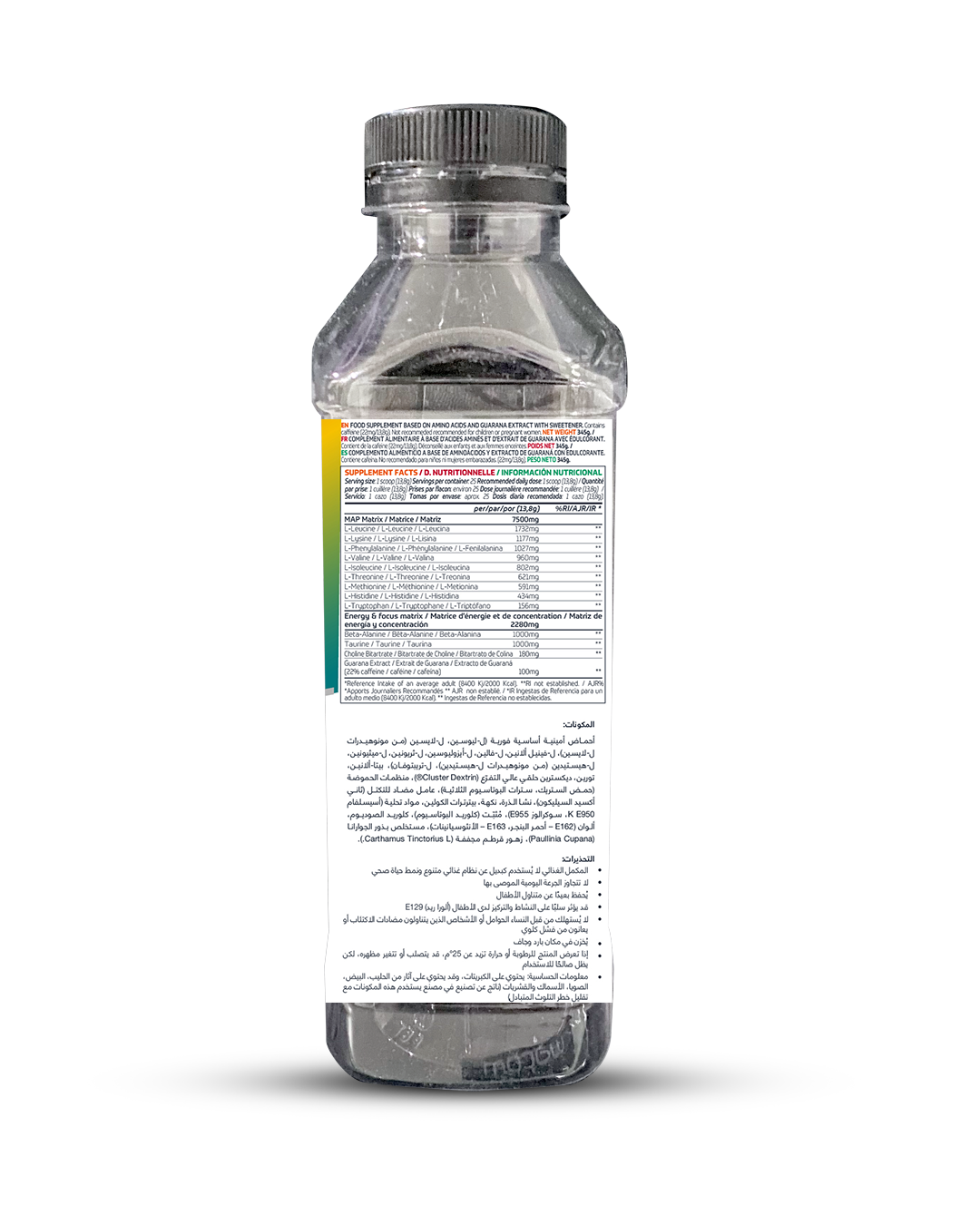 It is supplemented with Beta-Alanine to counteract fatigue and inhibit the accumulation of lactic acid, with taurine and choline bitartrate to increase concentration and the neurostimulatory response, as well as guarana as a stimulant to increase performance. It is supplemented with a small amount of Cluster Dextrin ® as a cutting-edge source of hydrates to provide a prolonged energy supply over time, making it the perfect supplement before or during training.